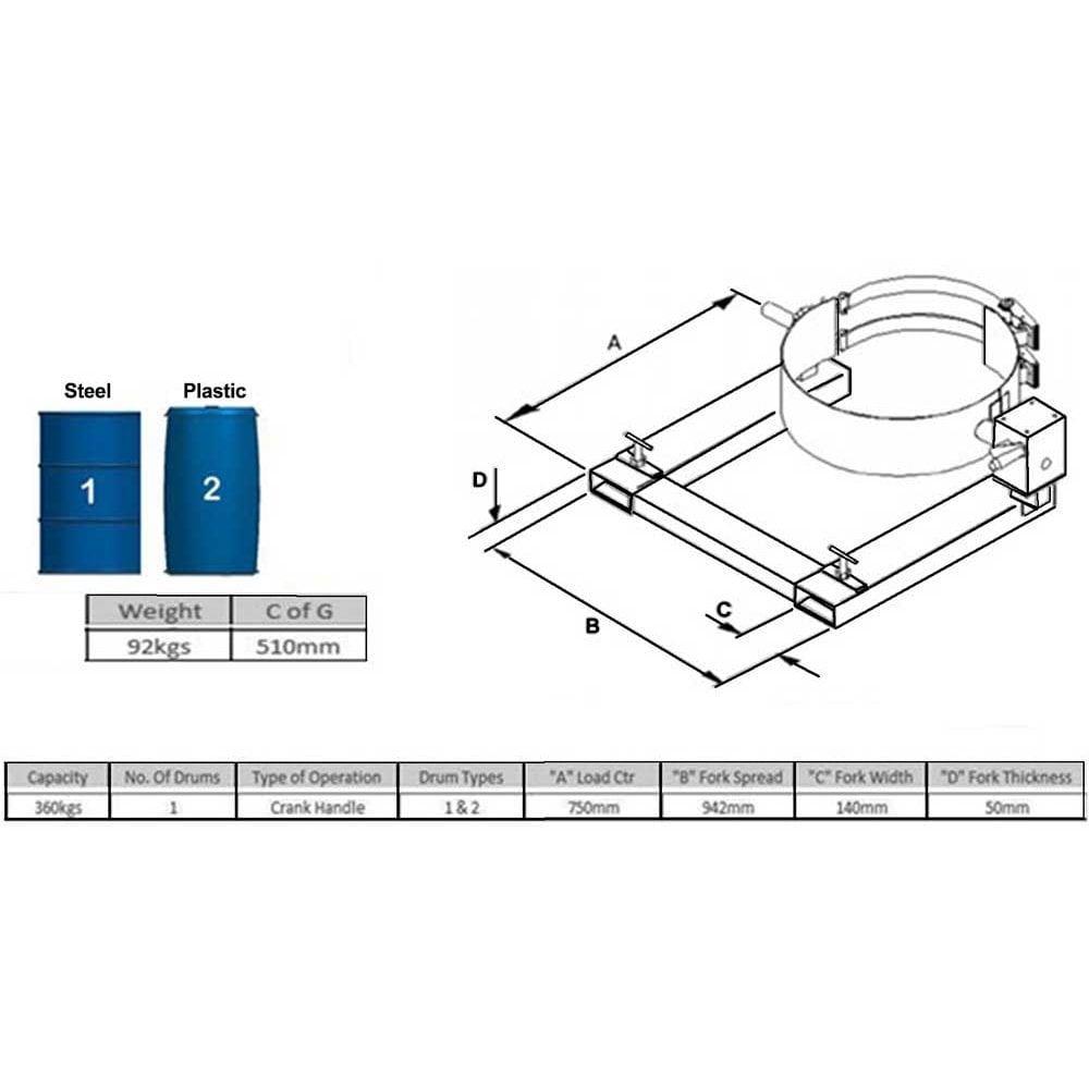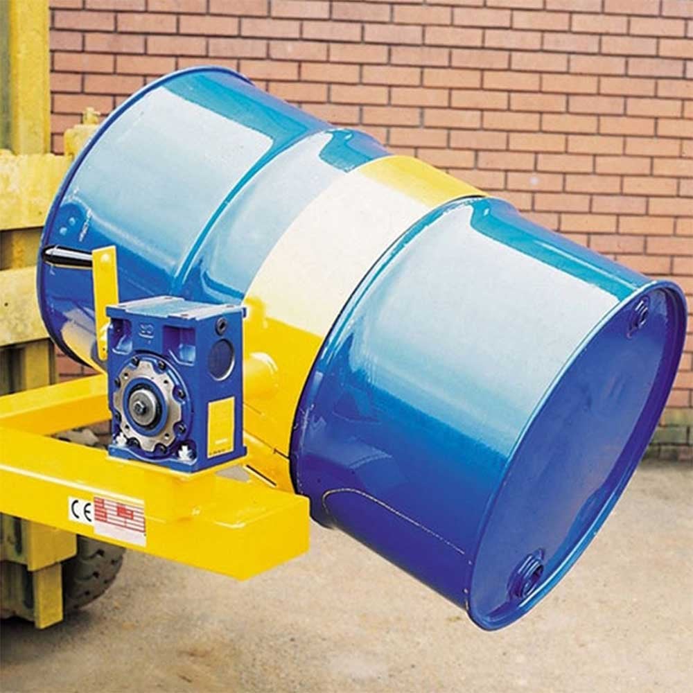This Clamp offers the ability to pick up, rotate and empty contents of drums in a safe, controlled and risk free manor. Our forklift drum rotators are the perfect solution for carrying out such drum manipulation tasks.With a high quality gear box connected to a crank handle for up to shoulder height rotation, the drum tipper will allow drums to be rotated through 360 degrees with minimal effort.Designed to suit 210 litre steel drums and also "L" & "XL" ring plastic drums, the drums are safely secured in place via two webbing and ratchet straps.Large "T" screws ensure the forklift drum rotator is safely fastened to the lift truck forks, and like all our forklift attachments, the drum rotator will come fully tested and certified to comply with the latest Health & Safety Regulations.
