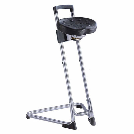 Height-adjustable anti-fatigue stools. Simple, tubular steel frame with slide/lock seat positioning. Allows infinite height adjustment between 600 and 850 mm