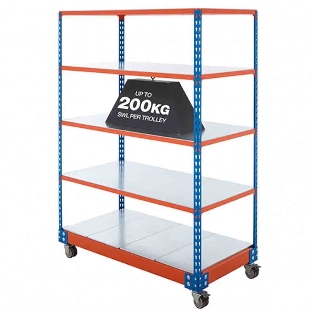 Steel Shelf Trolley 1720h x 1220w x 455d mm with 5 Levels 200kg SWL Blue & Orange