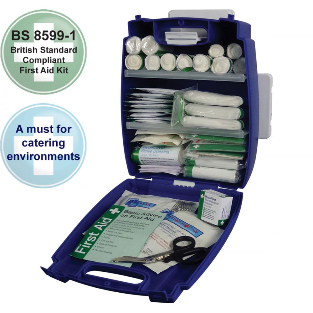 The First Aid Kit complies with British Standard requirements for catering environments, providing premium quality content stocked in a long lasting case. The First Aid Kit is supplied fully stocked and varies in size (small, medium and large) depending on your organisation needs. The first aid kit comes with adjustable shelves which allow the first aid content to be organised inside for an easy identification in case of an emergency. The first aid kit also includes a wall bracket providing great storage for the first aid kit as well as enhancing the visibility of the first aid point. The wall bracket allows the first aid kit to be opened and used as a workbench. It is highly recommended to catering environments.
